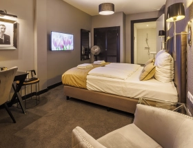 La camera Deluxe (Inside) è una camera lussuosamente arredata e offre un'oasi di pace. La particolarità di questa tipologia di camera è che alle camere è sempre stato aggiunto un elemento speciale. Si pensi al tema 007 (l'agente segreto) o al muro esterno del vecchio ufficio postale. La camera Deluxe (Inside) è dotata di scrivania, doccia e, naturalmente, occorrente per tè e caffè.